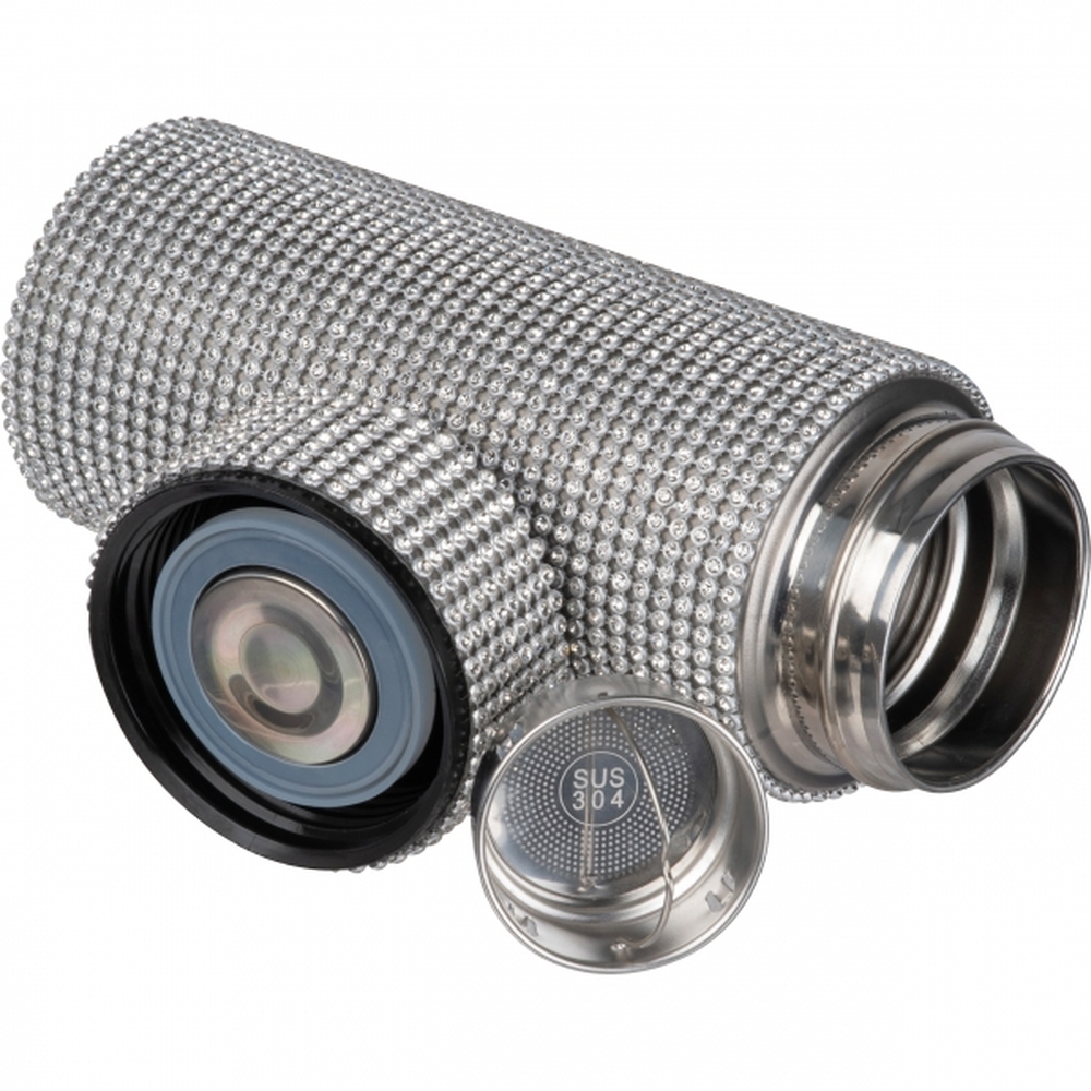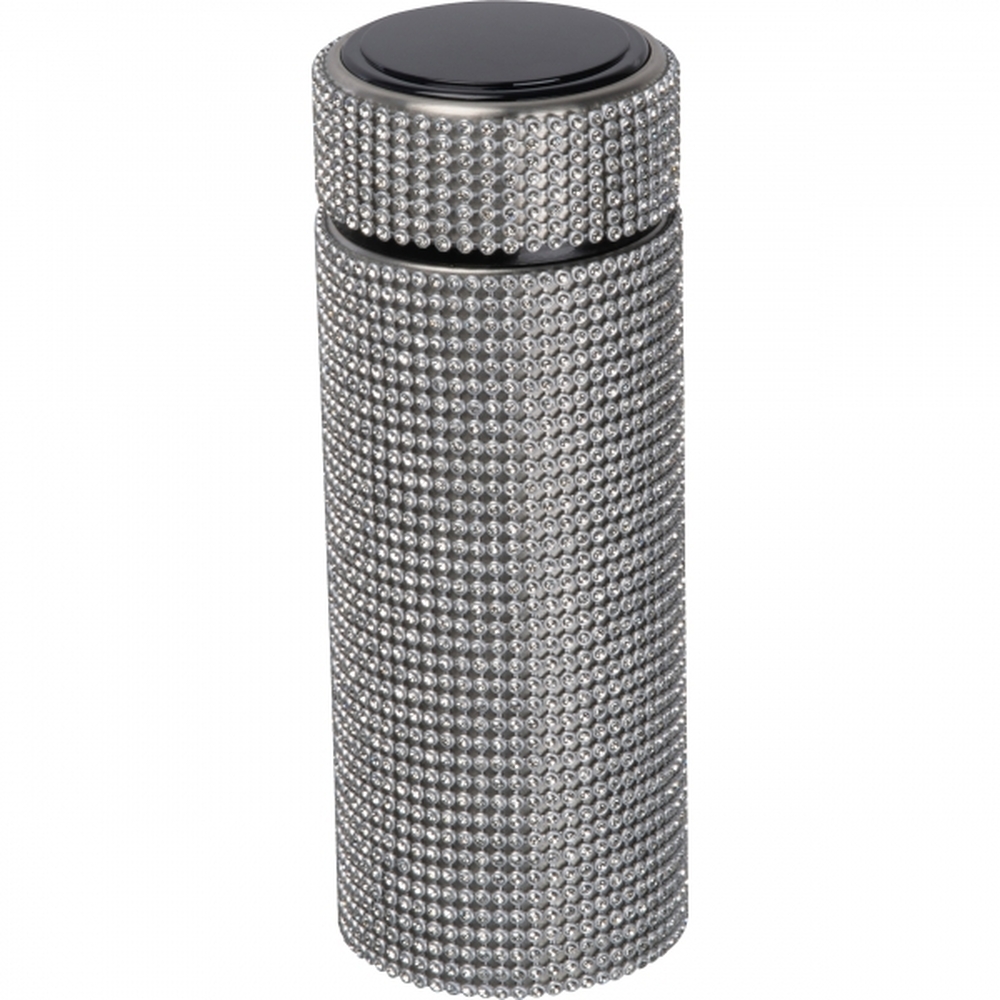 Butelka termiczna z podwójnymi ściankami, wykonana ze stali nierdzewnej ozdobionej cyrkoniami, pojemność 350 ml.